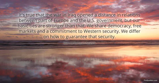 "It's true that the war in Iraq opened a distance in relations between part of Europe and the U.S. government, but our basic ties are stronger than that. We share democracy, free markets and a commitment to Western security. We differ on how to guarantee that security." FixQuotes, 16 Jan. 2026, https://fixquotes.com/quotes/its-true-that-the-war-in-iraq-opened-a-distance-98834/. Accessed 18 Feb. 2026.