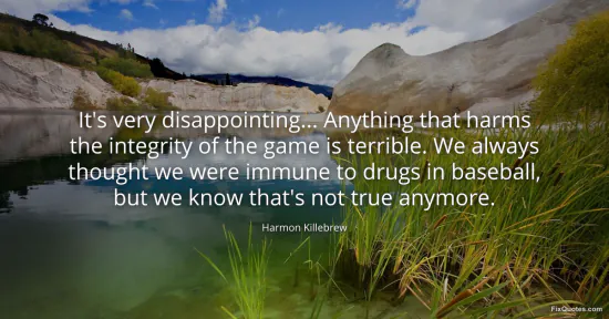Killebrew, Harmon. "It's very disappointing... Anything that harms the integrity of the game is terrible. We always thought we were immune to drugs in baseball, but we know that's not true anymore." FixQuotes. January 16, 2026. https://fixquotes.com/quotes/its-very-disappointing-anything-that-harms-the-120751/.