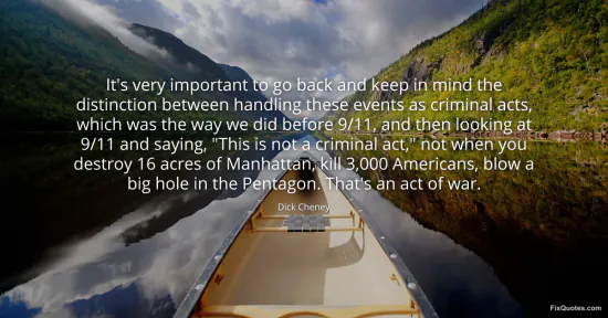 Cheney, Dick. "It's very important to go back and keep in mind the distinction between handling these events as criminal acts, which was the way we did before 9/11, and then looking at 9/11 and saying, "This is not a criminal act," not when you destroy 16 acres of Manhattan, kill 3,000 Americans, blow a big hole in the Pentagon. That's an act of war." FixQuotes. January 18, 2026. https://fixquotes.com/quotes/its-very-important-to-go-back-and-keep-in-mind-17586/.