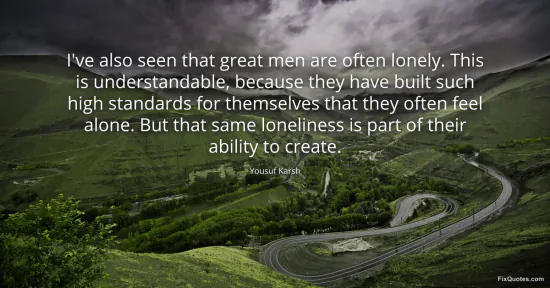 Karsh, Yousuf. "I've also seen that great men are often lonely. This is understandable, because they have built such high standards for themselves that they often feel alone. But that same loneliness is part of their ability to create." FixQuotes. January 16, 2026. https://fixquotes.com/quotes/ive-also-seen-that-great-men-are-often-lonely-132648/.