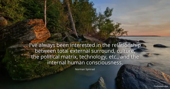 Spinrad, Norman. (2026, January 15). I've always been interested in the relationship between total external surround, culture, the political matrix, technology, etc., and the internal human consciousness. FixQuotes. https://fixquotes.com/quotes/ive-always-been-interested-in-the-relationship-168200/