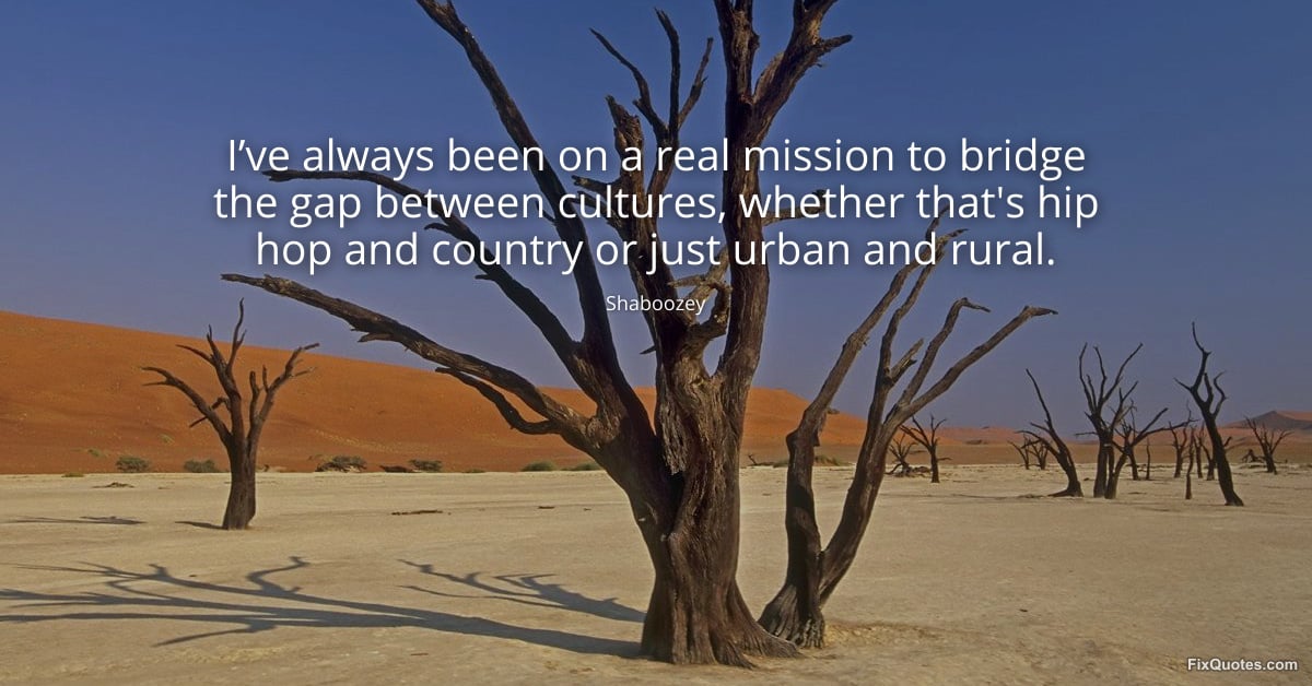 Shaboozey. (2026, March 20). I’ve always been on a real mission to bridge the gap between cultures, whether that's hip hop and country or just urban and rural. FixQuotes. https://fixquotes.com/quotes/ive-always-been-on-a-real-mission-to-bridge-the-186179/