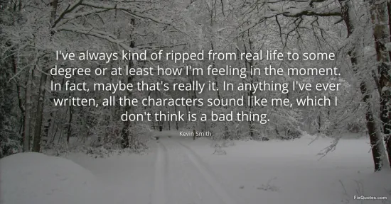Smith, Kevin. "I've always kind of ripped from real life to some degree or at least how I'm feeling in the moment. In fact, maybe that's really it. In anything I've ever written, all the characters sound like me, which I don't think is a bad thing." FixQuotes. January 17, 2026. https://fixquotes.com/quotes/ive-always-kind-of-ripped-from-real-life-to-some-81023/.