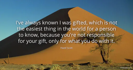 There is a sly tightrope act in Hazel Scott claiming giftedness without tipping into arrogance. She states the taboo plainly - "I've always known" - then immediately disciplines it. The line turns a potentially smug confession into an ethics lesson: talent is an accident of birth and circumstance, but character is a choice. That pivot is the whole move. She keeps the glow of self-belief while refusing the cheap moral credit people like to attach to "genius."