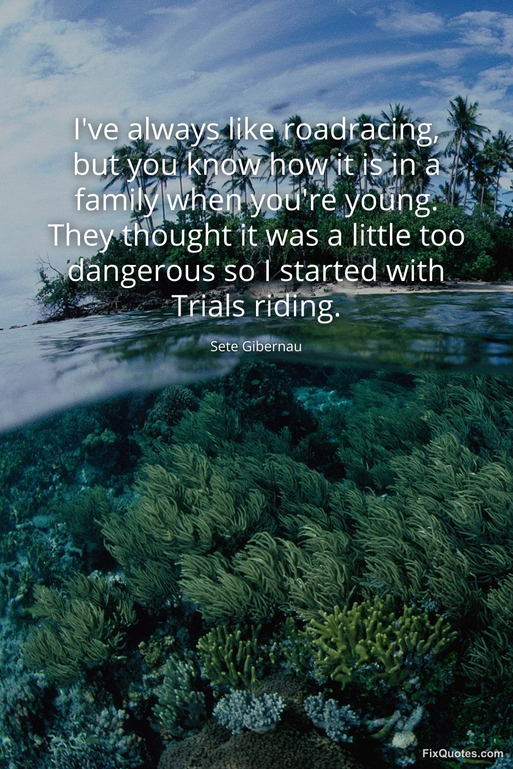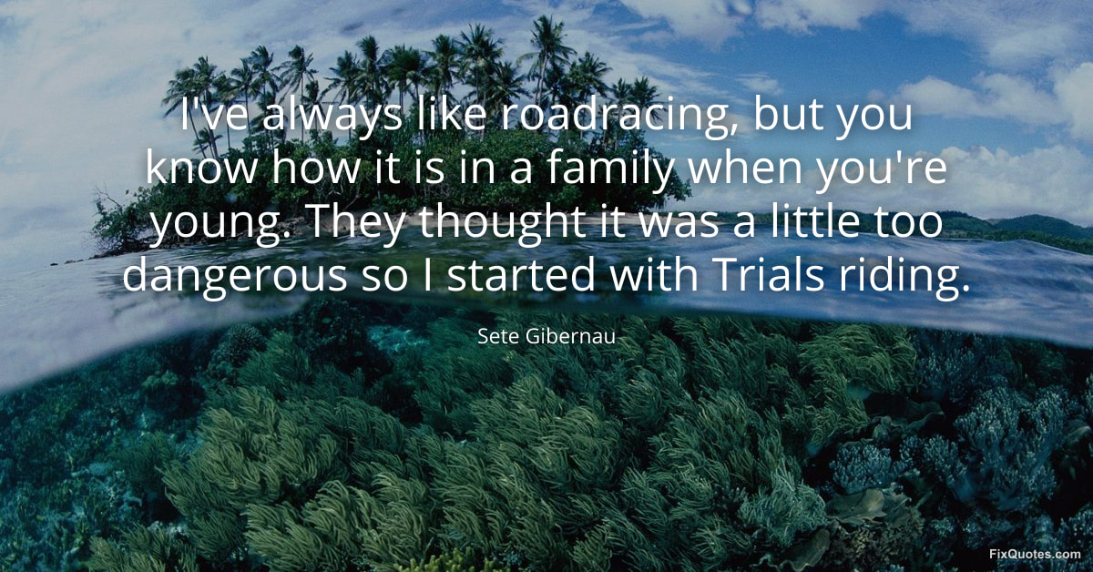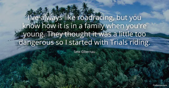 Gibernau, Sete. "I've always like roadracing, but you know how it is in a family when you're young. They thought it was a little too dangerous so I started with Trials riding." FixQuotes. January 16, 2026. https://fixquotes.com/quotes/ive-always-like-roadracing-but-you-know-how-it-is-129307/.