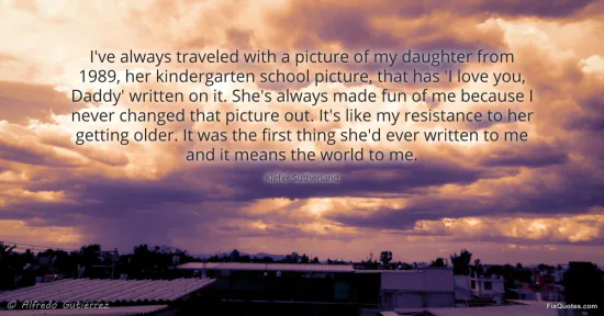 Sutherland, Kiefer. "I've always traveled with a picture of my daughter from 1989, her kindergarten school picture, that has 'I love you, Daddy' written on it. She's always made fun of me because I never changed that picture out. It's like my resistance to her getting older. It was the first thing she'd ever written to me and it means the world to me." FixQuotes. January 15, 2026. https://fixquotes.com/quotes/ive-always-traveled-with-a-picture-of-my-daughter-102001/.