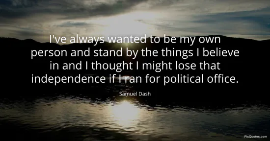 Dash, Samuel. "I've always wanted to be my own person and stand by the things I believe in and I thought I might lose that independence if I ran for political office." FixQuotes. January 15, 2026. https://fixquotes.com/quotes/ive-always-wanted-to-be-my-own-person-and-stand-161685/.
