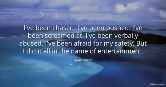 Mandel, Howie. "I've been chased. I've been pushed. I've been screamed at. I've been verbally abused. I've been afraid for my safety. But I did it all in the name of entertainment." FixQuotes. January 15, 2026. https://fixquotes.com/quotes/ive-been-chased-ive-been-pushed-ive-been-screamed-167589/.