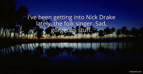 Doerr, Anthony. "I've been getting into Nick Drake lately, the folk singer. Sad, gorgeous stuff." FixQuotes. January 17, 2026. https://fixquotes.com/quotes/ive-been-getting-into-nick-drake-lately-the-folk-38635/.