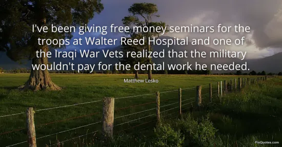 Lesko, Matthew. (2026, January 16). I've been giving free money seminars for the troops at Walter Reed Hospital and one of the Iraqi War Vets realized that the military wouldn't pay for the dental work he needed. FixQuotes. https://fixquotes.com/quotes/ive-been-giving-free-money-seminars-for-the-130012/