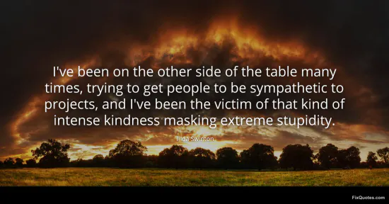 Swinton, Tilda. (2026, January 15). I've been on the other side of the table many times, trying to get people to be sympathetic to projects, and I've been the victim of that kind of intense kindness masking extreme stupidity. FixQuotes. https://fixquotes.com/quotes/ive-been-on-the-other-side-of-the-table-many-154911/