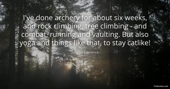 Lawrence, Jennifer. (2026, January 16). I've done archery for about six weeks, and rock climbing, tree climbing - and combat, running and vaulting. But also yoga and things like that, to stay catlike! FixQuotes. https://fixquotes.com/quotes/ive-done-archery-for-about-six-weeks-and-rock-86293/