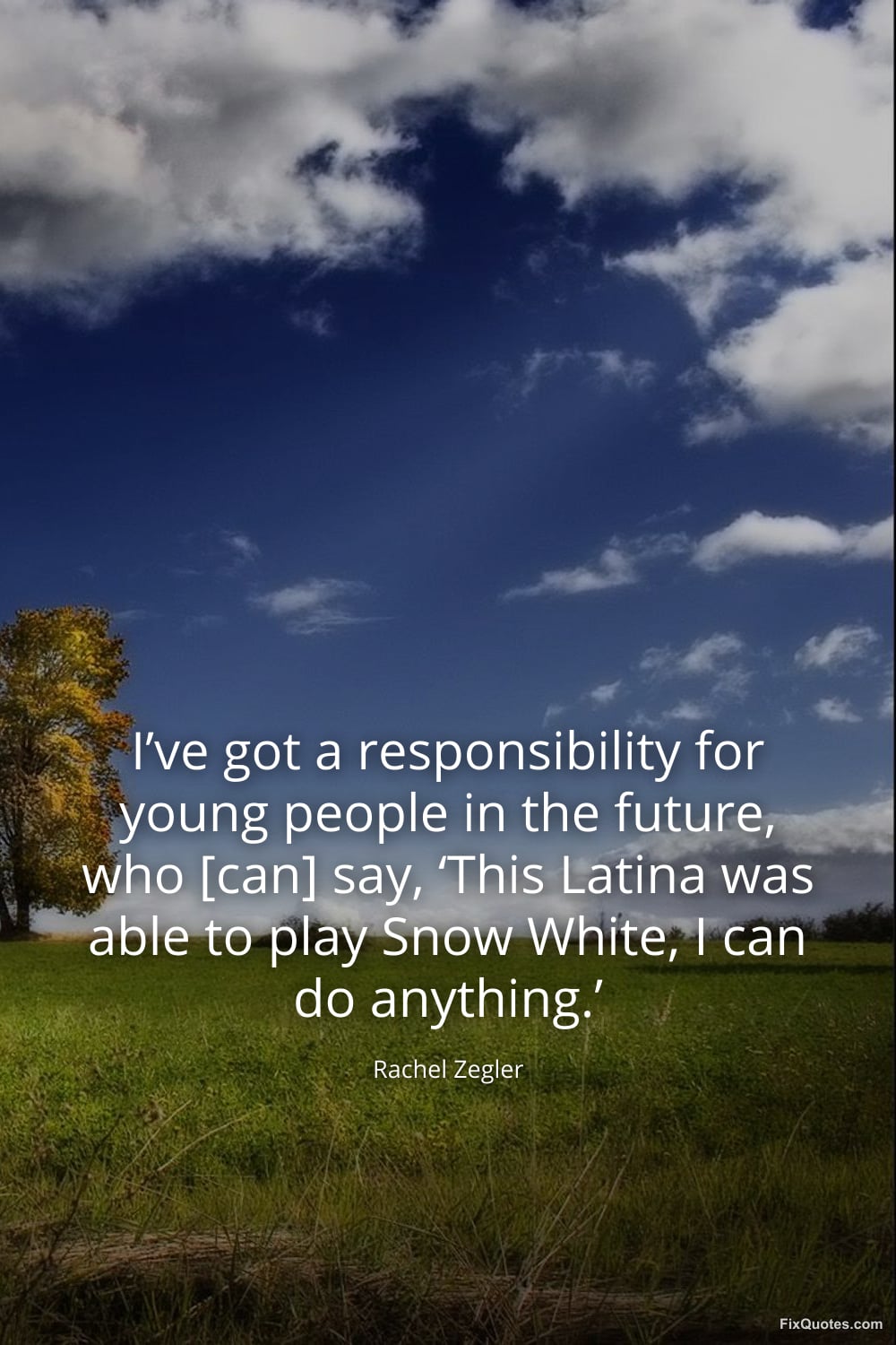 "I’ve got a responsibility for young people in the future, who [can] say, ‘This Latina was able to play Snow White, I can do anything.’." FixQuotes, 18 Mar. 2026, https://fixquotes.com/quotes/ive-got-a-responsibility-for-young-people-in-the-186144/. Accessed 18 Mar. 2026.