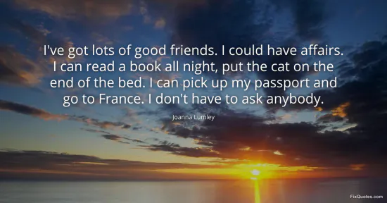 Lumley, Joanna. (2026, January 15). I've got lots of good friends. I could have affairs. I can read a book all night, put the cat on the end of the bed. I can pick up my passport and go to France. I don't have to ask anybody. FixQuotes. https://fixquotes.com/quotes/ive-got-lots-of-good-friends-i-could-have-affairs-92617/