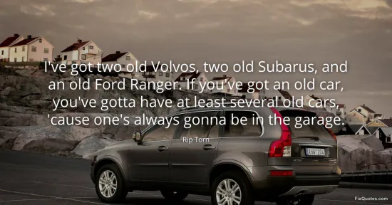 Torn, Rip. "I've got two old Volvos, two old Subarus, and an old Ford Ranger. If you've got an old car, you've gotta have at least several old cars, 'cause one's always gonna be in the garage." FixQuotes. January 16, 2026. https://fixquotes.com/quotes/ive-got-two-old-volvos-two-old-subarus-and-an-old-128716/.