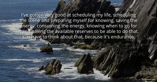 Cruise, Tom. (2026, January 16). I've gotten very good at scheduling my life, scheduling the scene and preparing myself for knowing, saving the energy, consuming the energy, knowing when to go for it and having the available reserves to be able to do that. You have to think about that, because it's endurance. FixQuotes. https://fixquotes.com/quotes/ive-gotten-very-good-at-scheduling-my-life-86778/