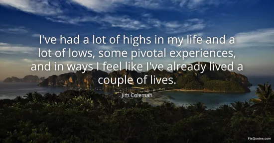 Coleman, Jim. "I've had a lot of highs in my life and a lot of lows, some pivotal experiences, and in ways I feel like I've already lived a couple of lives." FixQuotes. January 17, 2026. https://fixquotes.com/quotes/ive-had-a-lot-of-highs-in-my-life-and-a-lot-of-78600/.
