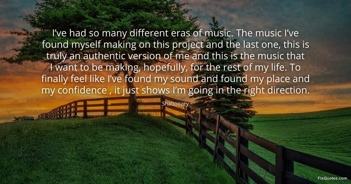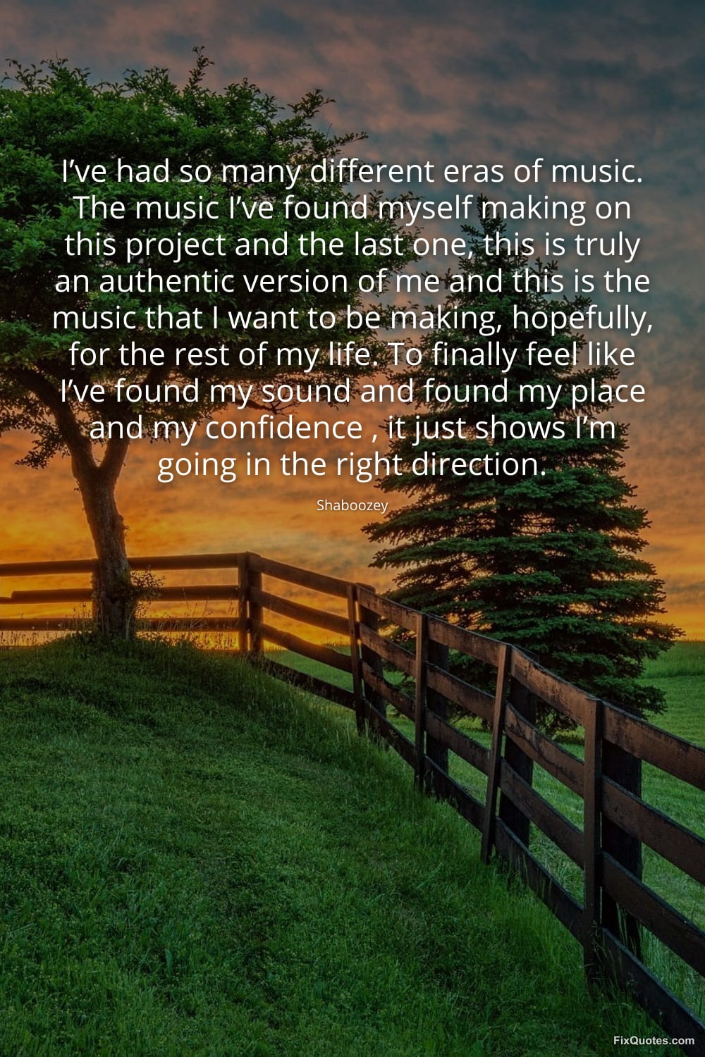 Shaboozey. "I’ve had so many different eras of music. The music I’ve found myself making on this project and the last one, this is truly an authentic version of me and this is the music that I want to be making, hopefully, for the rest of my life. To finally feel like I’ve found my sound and found my place and my confidence , it just shows I’m going in the right direction." FixQuotes. March 20, 2026. https://fixquotes.com/quotes/ive-had-so-many-different-eras-of-music-the-music-186186/.