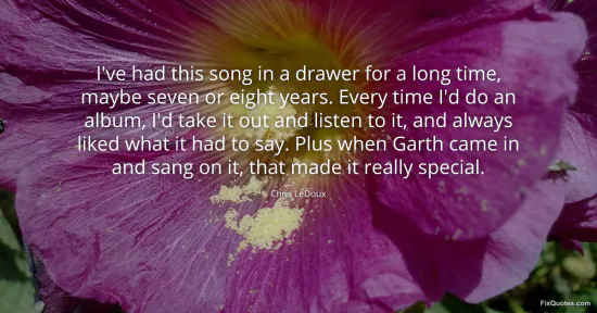LeDoux, Chris. (2026, January 17). I've had this song in a drawer for a long time, maybe seven or eight years. Every time I'd do an album, I'd take it out and listen to it, and always liked what it had to say. Plus when Garth came in and sang on it, that made it really special. FixQuotes. https://fixquotes.com/quotes/ive-had-this-song-in-a-drawer-for-a-long-time-66666/
