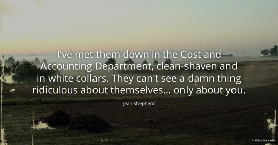 Shepherd, Jean. (2026, January 16). I've met them down in the Cost and Accounting Department, clean-shaven and in white collars. They can't see a damn thing ridiculous about themselves... only about you. FixQuotes. https://fixquotes.com/quotes/ive-met-them-down-in-the-cost-and-accounting-109513/