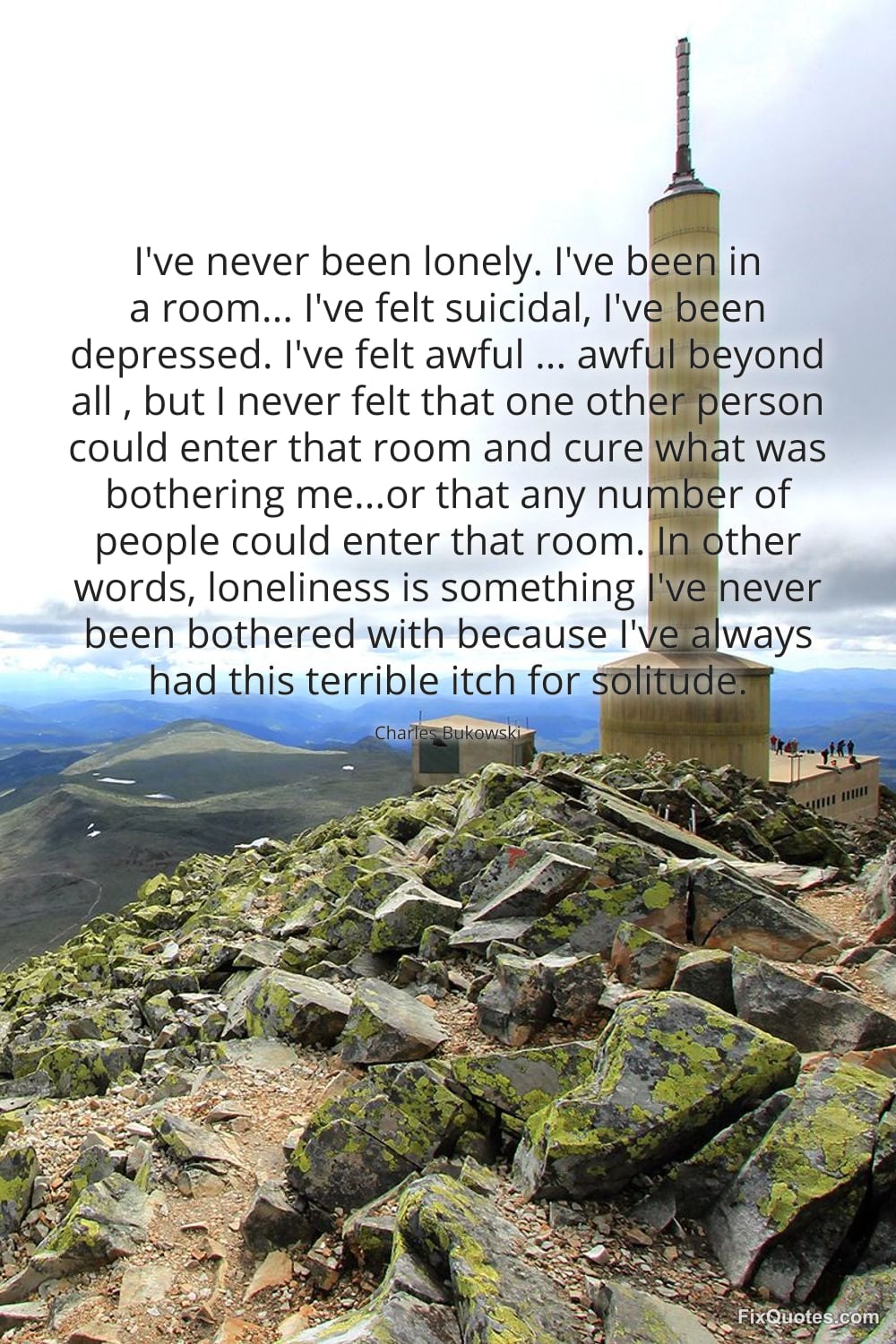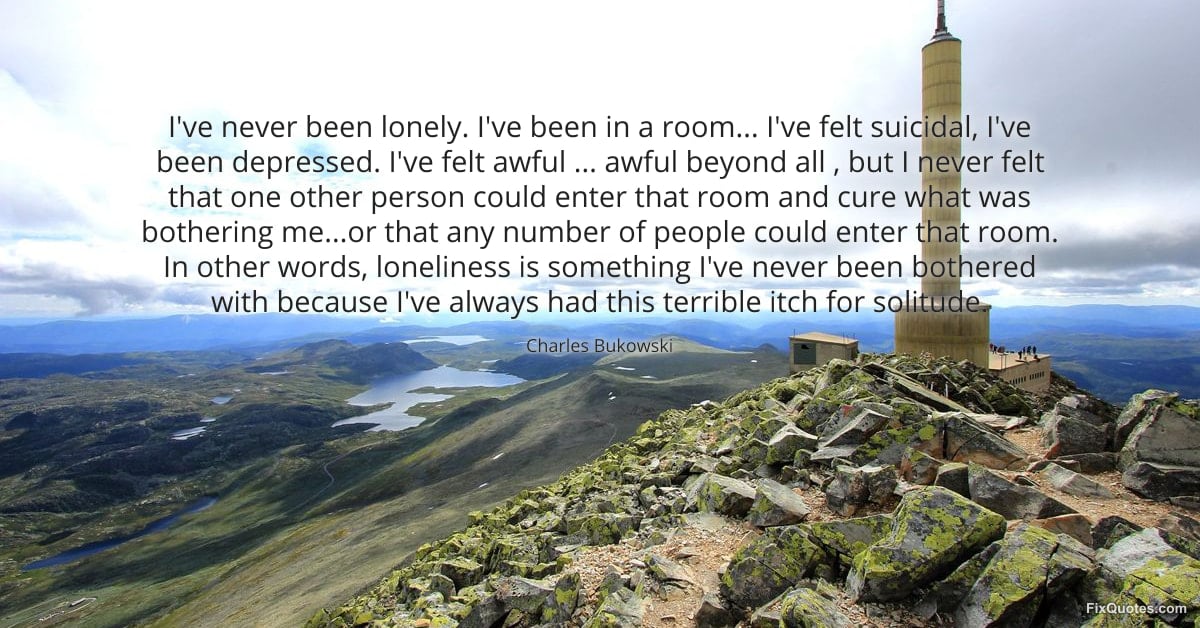 Bukowski, Charles. (2026, February 10). I've never been lonely. I've been in a room... I've felt suicidal, I've been depressed. I've felt awful ... awful beyond all , but I never felt that one other person could enter that room and cure what was bothering me...or that any number of people could enter that room. In other words, loneliness is something I've never been bothered with because I've always had this terrible itch for solitude. FixQuotes. https://fixquotes.com/quotes/ive-never-been-lonely-ive-been-in-a-room-ive-felt-185154/