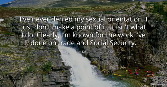 Kolbe, Jim. "I've never denied my sexual orientation. I just don't make a point of it. It isn't what I do. Clearly, I'm known for the work I've done on trade and Social Security." FixQuotes. January 16, 2026. https://fixquotes.com/quotes/ive-never-denied-my-sexual-orientation-i-just-117717/.
