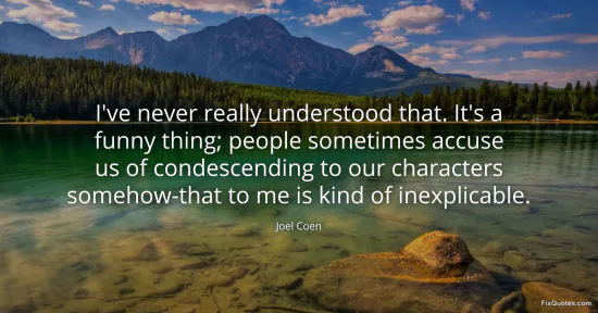 Coen, Joel. "I've never really understood that. It's a funny thing; people sometimes accuse us of condescending to our characters somehow-that to me is kind of inexplicable." FixQuotes. January 17, 2026. https://fixquotes.com/quotes/ive-never-really-understood-that-its-a-funny-50863/.