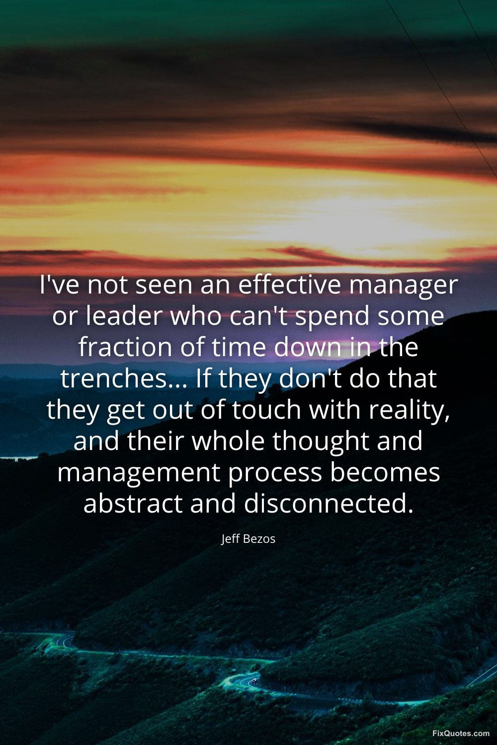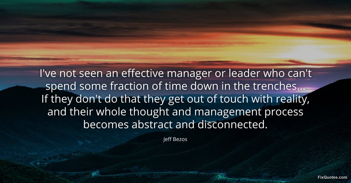 Bezos, Jeff. (2026, March 25). I've not seen an effective manager or leader who can't spend some fraction of time down in the trenches... If they don't do that they get out of touch with reality, and their whole thought and management process becomes abstract and disconnected. FixQuotes. https://fixquotes.com/quotes/ive-not-seen-an-effective-manager-or-leader-who-186435/