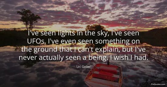 Geller, Uri. "I've seen lights in the sky, I've seen UFOs, I've even seen something on the ground that I can't explain, but I've never actually seen a being. I wish I had." FixQuotes. January 15, 2026. https://fixquotes.com/quotes/ive-seen-lights-in-the-sky-ive-seen-ufos-ive-even-150173/.