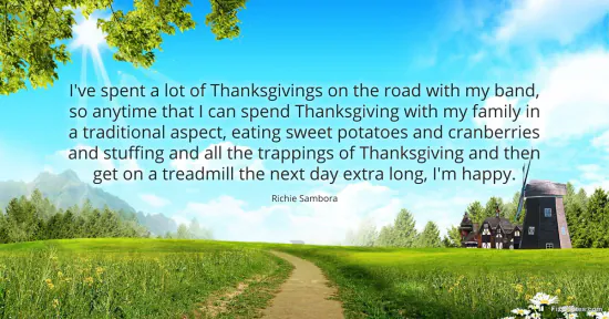 Sambora, Richie. "I've spent a lot of Thanksgivings on the road with my band, so anytime that I can spend Thanksgiving with my family in a traditional aspect, eating sweet potatoes and cranberries and stuffing and all the trappings of Thanksgiving and then get on a treadmill the next day extra long, I'm happy." FixQuotes. January 16, 2026. https://fixquotes.com/quotes/ive-spent-a-lot-of-thanksgivings-on-the-road-with-106555/.