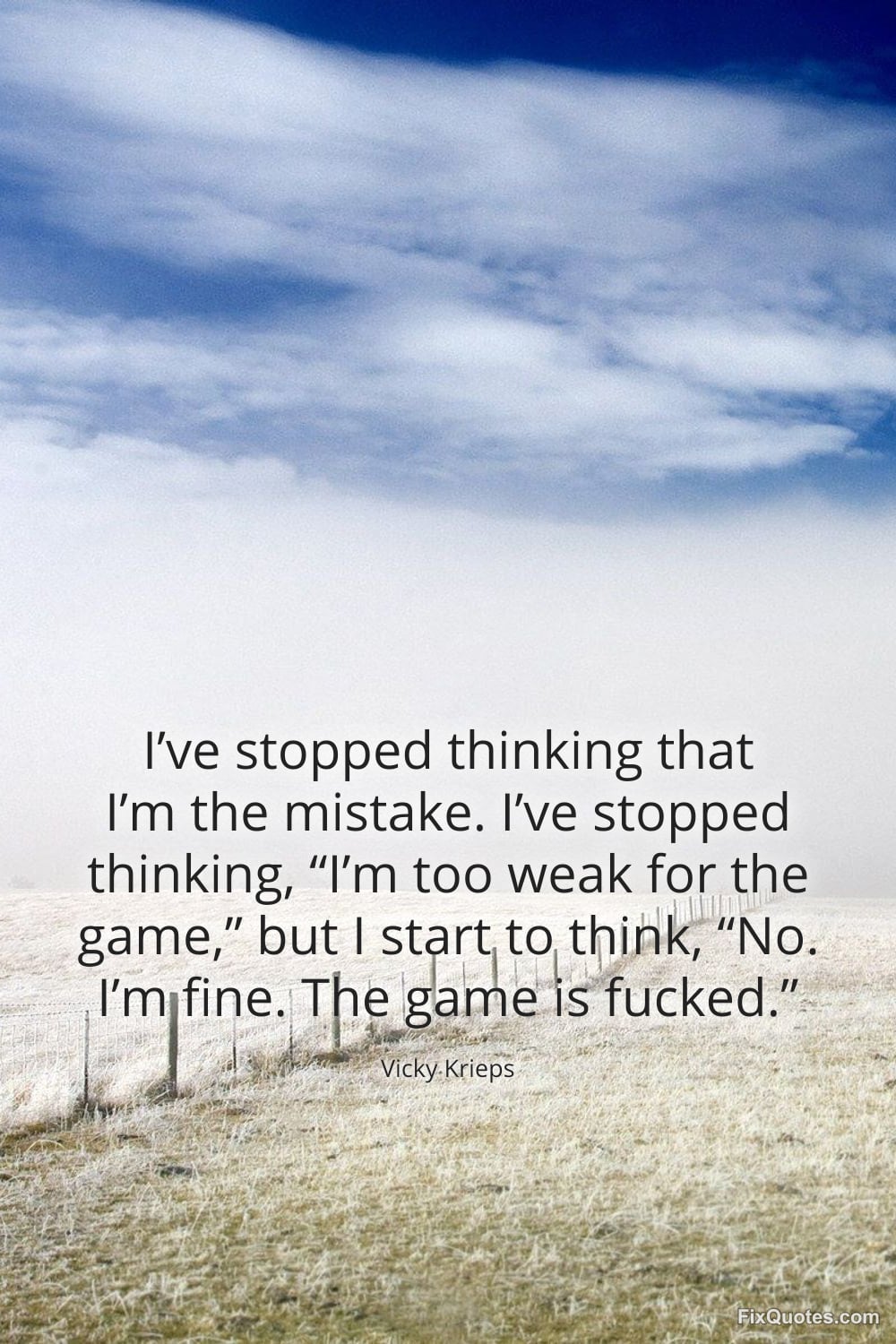Krieps, Vicky. (2026, February 16). I've stopped thinking that I'm the mistake. I've stopped thinking, "I'm too weak for the game", but I start to think, "No. I'm fine. The game is fucked". FixQuotes. https://fixquotes.com/quotes/ive-stopped-thinking-that-im-the-mistake-ive-185563/