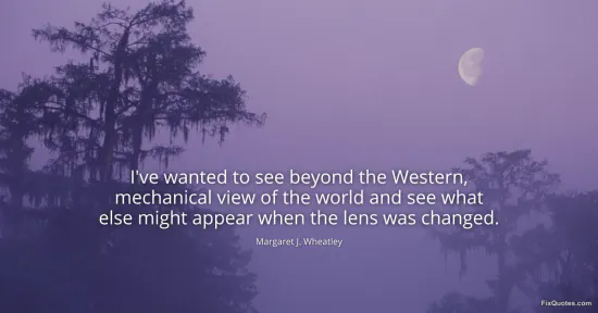 Wheatley, Margaret J. (2026, January 17). I've wanted to see beyond the Western, mechanical view of the world and see what else might appear when the lens was changed. FixQuotes. https://fixquotes.com/quotes/ive-wanted-to-see-beyond-the-western-mechanical-81760/
