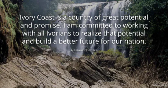 "Ivory Coast is a country of great potential and promise. I am committed to working with all Ivorians to realize that potential and build a better future for our nation." FixQuotes, 14 Jan. 2026, https://fixquotes.com/quotes/ivory-coast-is-a-country-of-great-potential-and-171559/. Accessed 10 Feb. 2026.