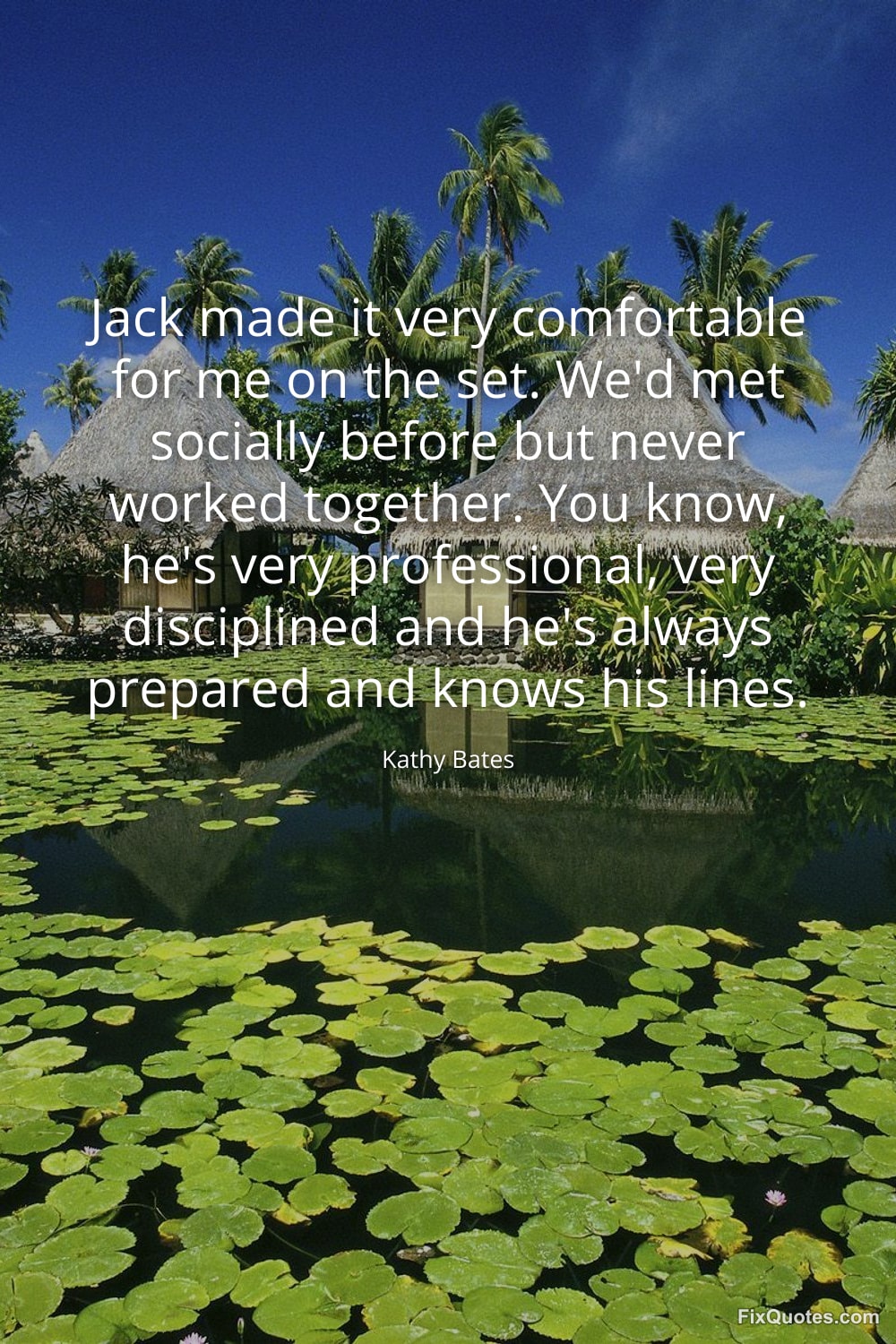 Bates, Kathy. "Jack made it very comfortable for me on the set. We'd met socially before but never worked together. You know, he's very professional, very disciplined and he's always prepared and knows his lines." FixQuotes. January 17, 2026. https://fixquotes.com/quotes/jack-made-it-very-comfortable-for-me-on-the-set-63092/.