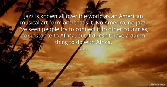 Blakey, Art. "Jazz is known all over the world as an American musical art form and that's it. No America, no jazz. I've seen people try to connect it to other countries, for instance to Africa, but it doesn't have a damn thing to do with Africa." FixQuotes. January 15, 2026. https://fixquotes.com/quotes/jazz-is-known-all-over-the-world-as-an-american-97802/.