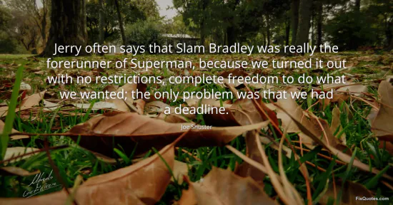 Shuster, Joe. "Jerry often says that Slam Bradley was really the forerunner of Superman, because we turned it out with no restrictions, complete freedom to do what we wanted; the only problem was that we had a deadline." FixQuotes. January 17, 2026. https://fixquotes.com/quotes/jerry-often-says-that-slam-bradley-was-really-the-55747/.