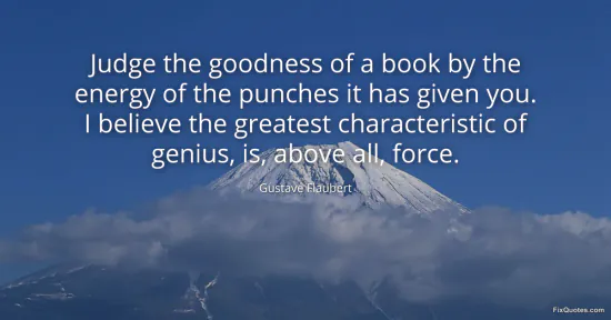 Flaubert, Gustave. "Judge the goodness of a book by the energy of the punches it has given you. I believe the greatest characteristic of genius, is, above all, force." FixQuotes. January 18, 2026. https://fixquotes.com/quotes/judge-the-goodness-of-a-book-by-the-energy-of-the-11723/.