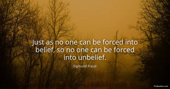Freud, Sigmund. "Just as no one can be forced into belief, so no one can be forced into unbelief." FixQuotes. January 13, 2026. https://fixquotes.com/quotes/just-as-no-one-can-be-forced-into-belief-so-no-21160/.