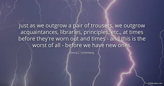 Lichtenberg, Georg C. (2026, January 18). Just as we outgrow a pair of trousers, we outgrow acquaintances, libraries, principles, etc., at times before they're worn out and times - and this is the worst of all - before we have new ones. FixQuotes. https://fixquotes.com/quotes/just-as-we-outgrow-a-pair-of-trousers-we-outgrow-13316/