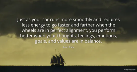 Tracy, Brian. "Just as your car runs more smoothly and requires less energy to go faster and farther when the wheels are in perfect alignment, you perform better when your thoughts, feelings, emotions, goals, and values are in balance." FixQuotes. January 17, 2026. https://fixquotes.com/quotes/just-as-your-car-runs-more-smoothly-and-requires-30318/.