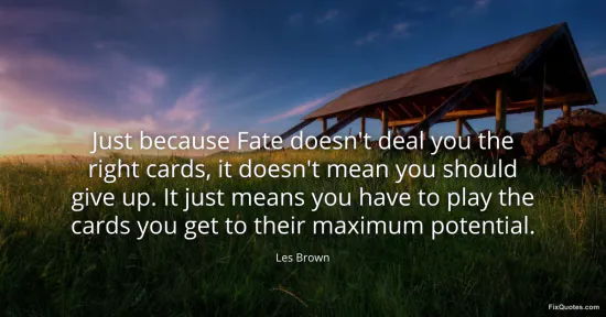 Brown, Les. "Just because Fate doesn't deal you the right cards, it doesn't mean you should give up. It just means you have to play the cards you get to their maximum potential." FixQuotes. January 18, 2026. https://fixquotes.com/quotes/just-because-fate-doesnt-deal-you-the-right-cards-22393/.