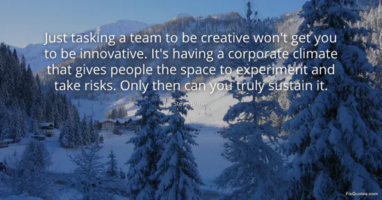 Brown, Steve. "Just tasking a team to be creative won't get you to be innovative. It's having a corporate climate that gives people the space to experiment and take risks. Only then can you truly sustain it." FixQuotes. January 15, 2026. https://fixquotes.com/quotes/just-tasking-a-team-to-be-creative-wont-get-you-165047/.