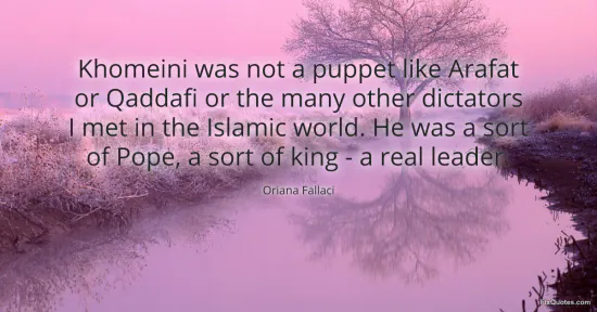 Fallaci, Oriana. "Khomeini was not a puppet like Arafat or Qaddafi or the many other dictators I met in the Islamic world. He was a sort of Pope, a sort of king - a real leader." FixQuotes. January 16, 2026. https://fixquotes.com/quotes/khomeini-was-not-a-puppet-like-arafat-or-qaddafi-89577/.