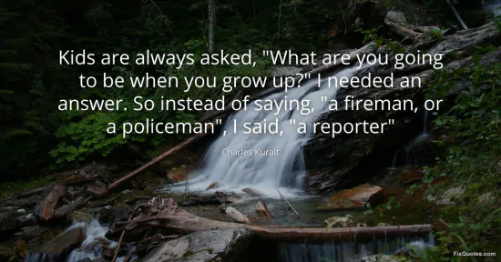 Kuralt, Charles. "Kids are always asked, "What are you going to be when you grow up?" I needed an answer. So instead of saying, "a fireman, or a policeman", I said, "a reporter"." FixQuotes. February 16, 2026. https://fixquotes.com/quotes/kids-are-always-asked-what-are-you-going-to-be-139570/.