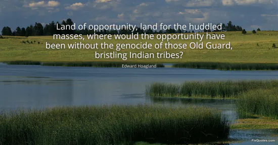 Hoagland, Edward. (2026, February 18). Land of opportunity, land for the huddled masses, where would the opportunity have been without the genocide of those Old Guard, bristling Indian tribes? FixQuotes. https://fixquotes.com/quotes/land-of-opportunity-land-for-the-huddled-masses-70381/