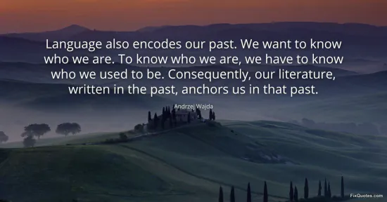 Wajda, Andrzej. (2026, January 17). Language also encodes our past. We want to know who we are. To know who we are, we have to know who we used to be. Consequently, our literature, written in the past, anchors us in that past. FixQuotes. https://fixquotes.com/quotes/language-also-encodes-our-past-we-want-to-know-39745/