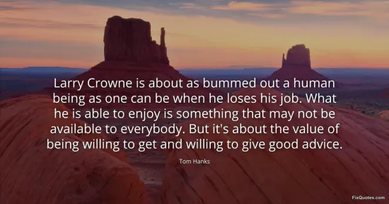 Hanks, Tom. (2026, January 15). Larry Crowne is about as bummed out a human being as one can be when he loses his job. What he is able to enjoy is something that may not be available to everybody. But it's about the value of being willing to get and willing to give good advice. FixQuotes. https://fixquotes.com/quotes/larry-crowne-is-about-as-bummed-out-a-human-being-151531/