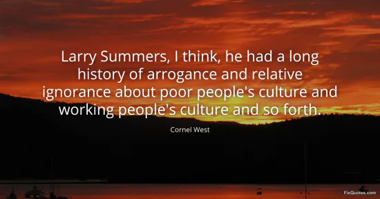 West, Cornel. (2026, January 17). Larry Summers, I think, he had a long history of arrogance and relative ignorance about poor people's culture and working people's culture and so forth. FixQuotes. https://fixquotes.com/quotes/larry-summers-i-think-he-had-a-long-history-of-46080/