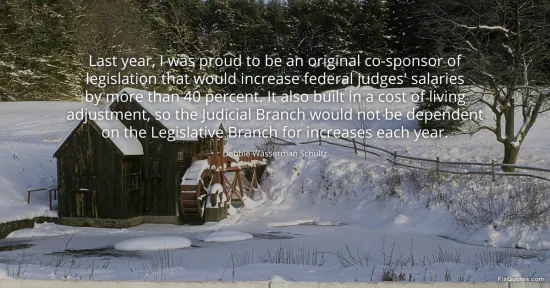 Schultz, Debbie Wasserman. "Last year, I was proud to be an original co-sponsor of legislation that would increase federal judges' salaries by more than 40 percent. It also built in a cost of living adjustment, so the Judicial Branch would not be dependent on the Legislative Branch for increases each year." FixQuotes. January 17, 2026. https://fixquotes.com/quotes/last-year-i-was-proud-to-be-an-original-41538/.
