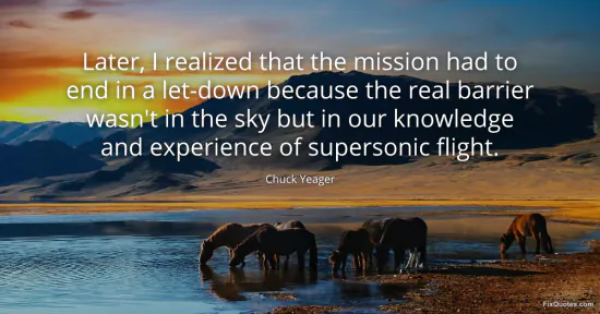 Yeager, Chuck. "Later, I realized that the mission had to end in a let-down because the real barrier wasn't in the sky but in our knowledge and experience of supersonic flight." FixQuotes. January 18, 2026. https://fixquotes.com/quotes/later-i-realized-that-the-mission-had-to-end-in-a-3756/.